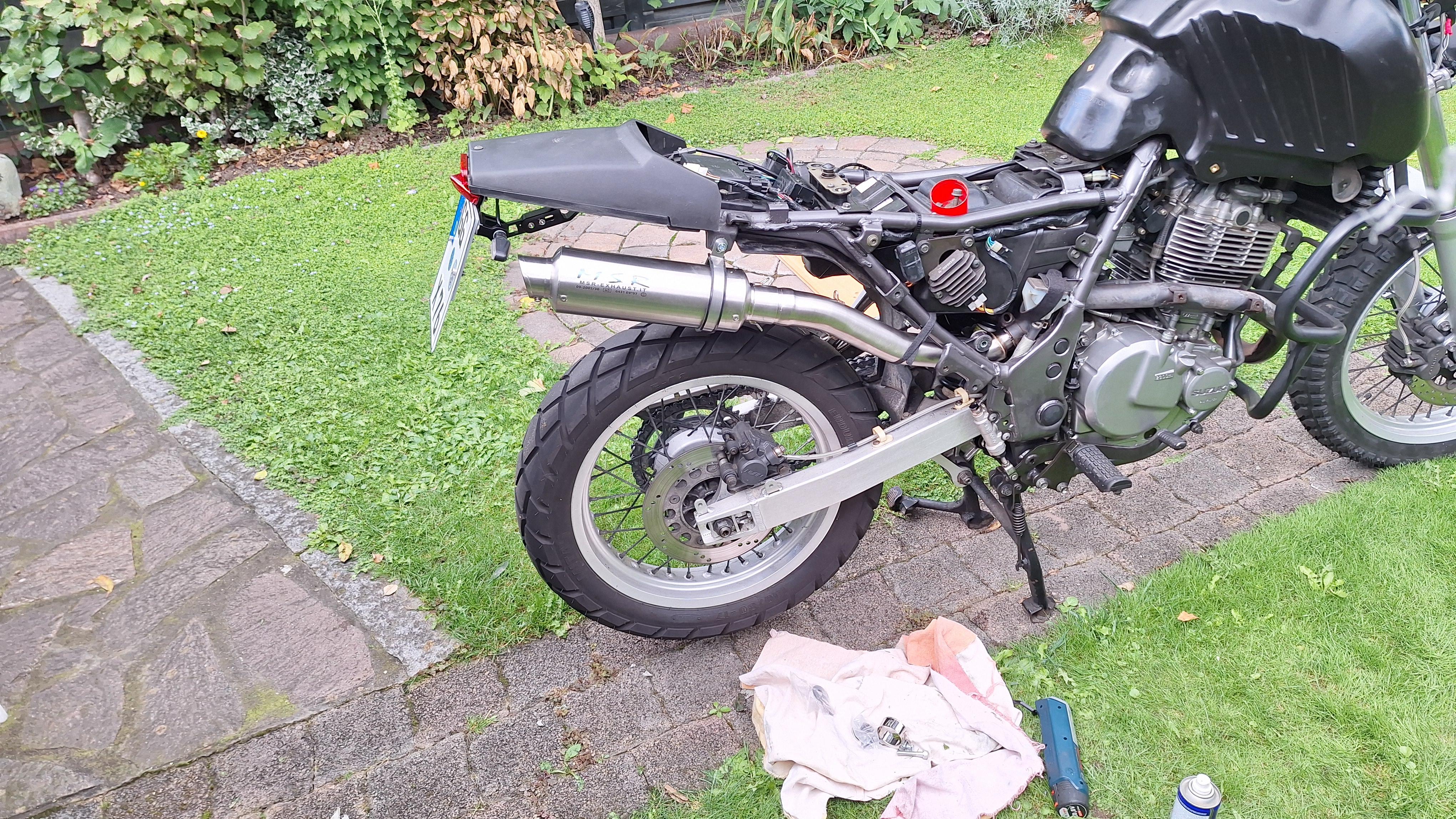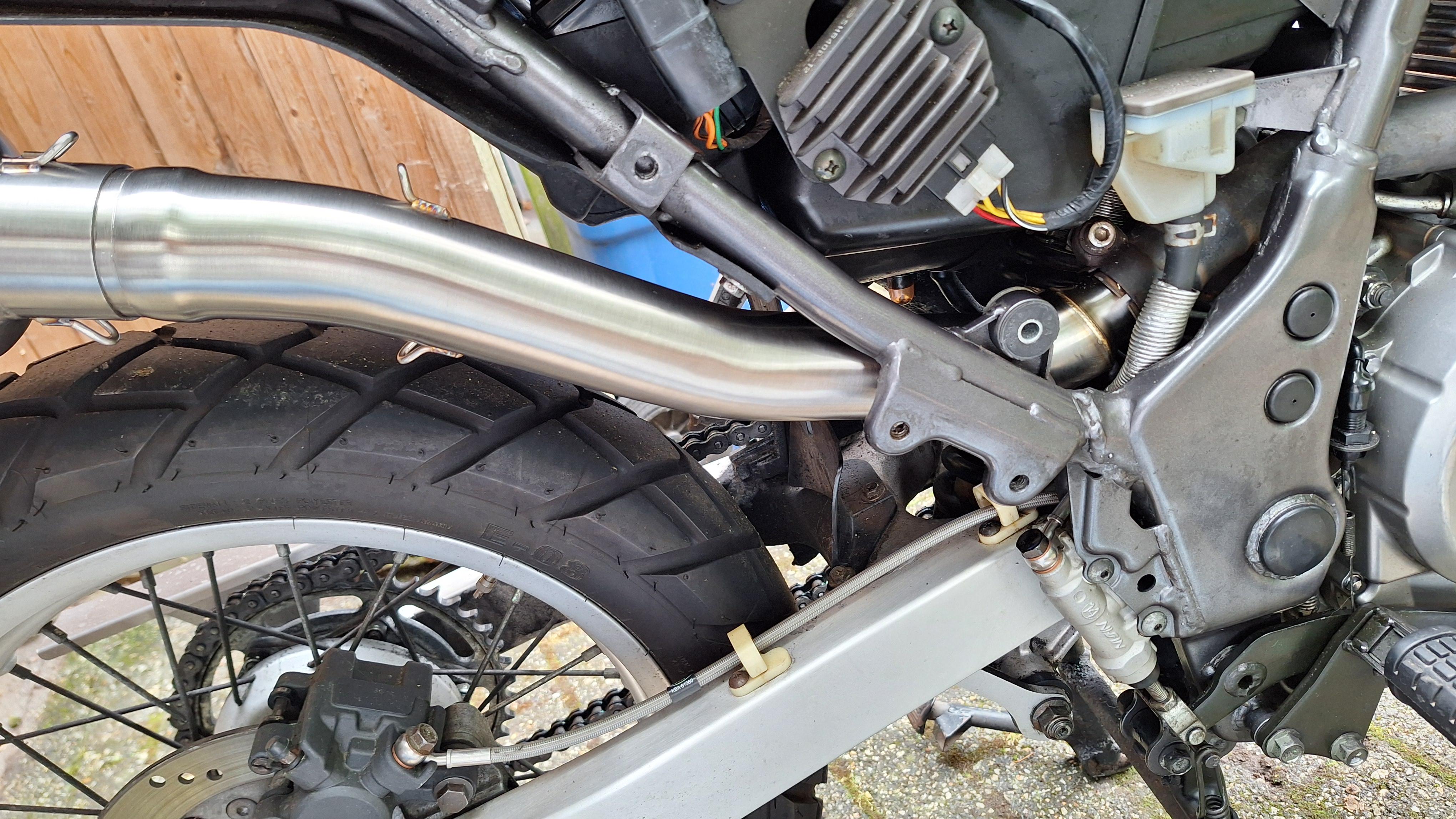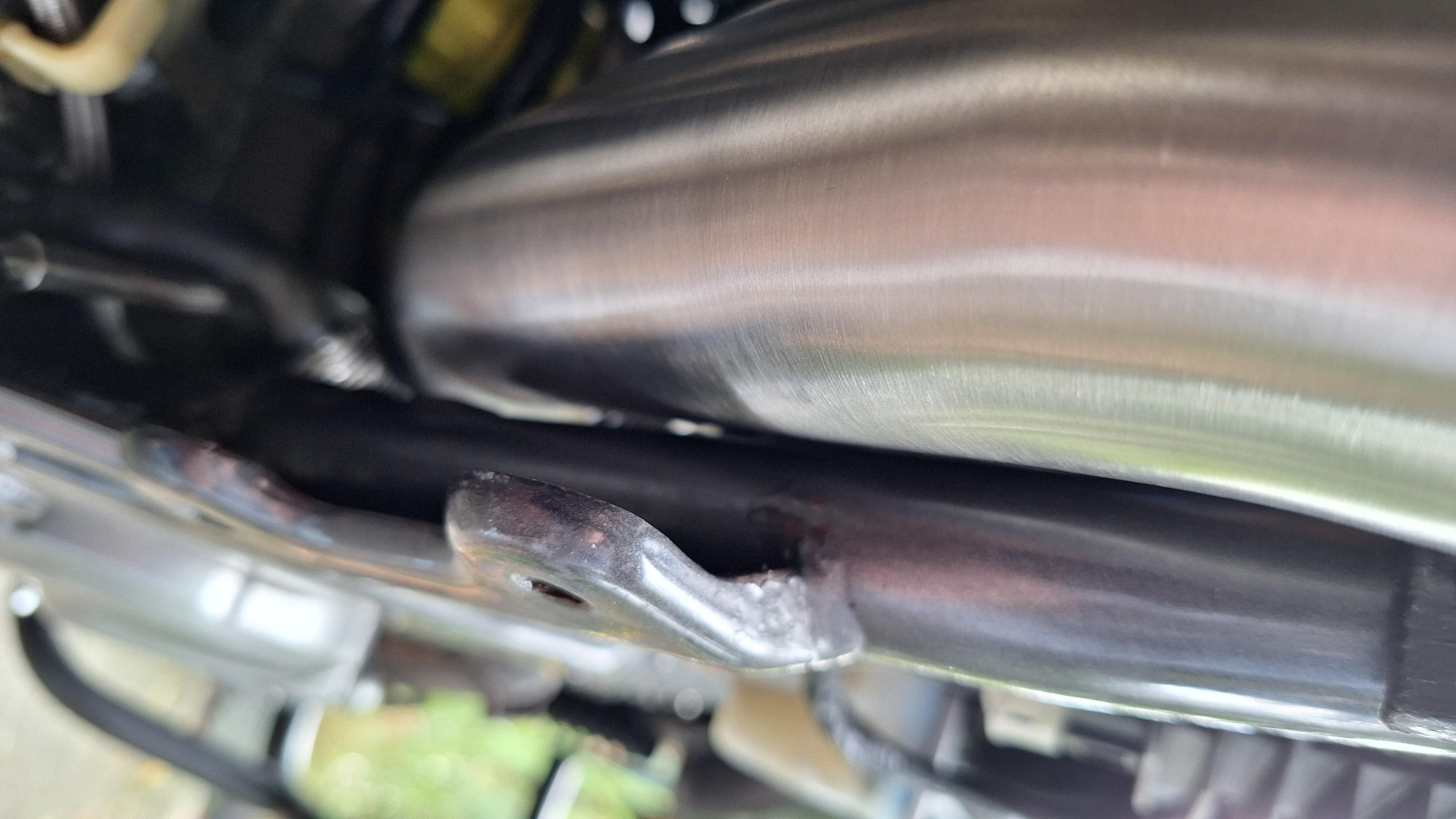 Super , danke . Der komplette Auspuff wird jetzt von den Krümmerschrauben im Zylinderkopf und der Schelle am Endtopf gehalten , das war vorher schon massiv befestigt ,mit 3 Schrauben