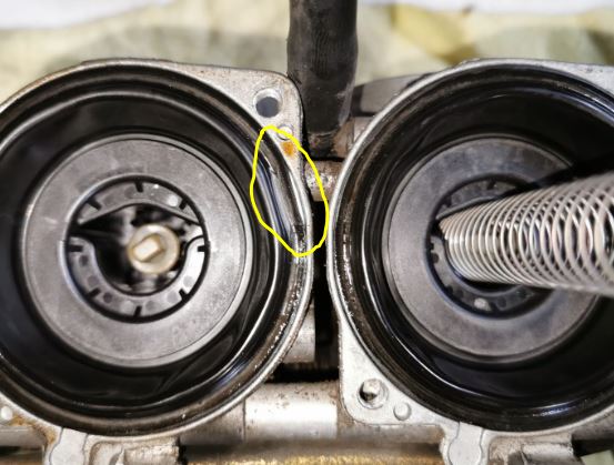 Zudem verliert die linke Schwimmerkammer (in Fahrtrichtung) im Stand minimal Sprit, weshalb ich gleich den/die Vergaser ausgebaut habe.