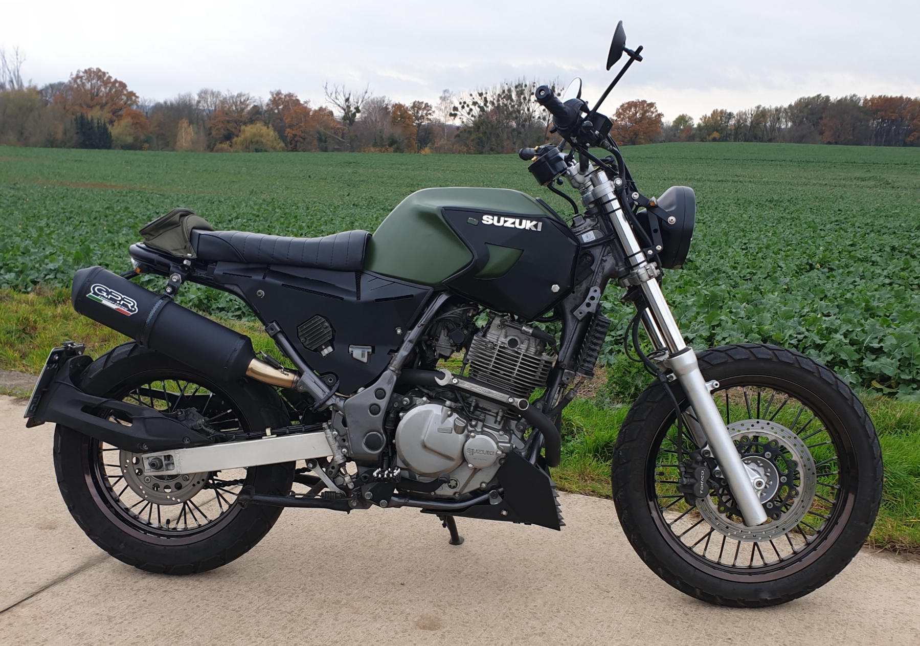 Nun mit Speichen-Cover, KTM-Duke 125 Bugspoiler und GPR-Auspuff. Der Bugspoiler macht sich sehr gut.