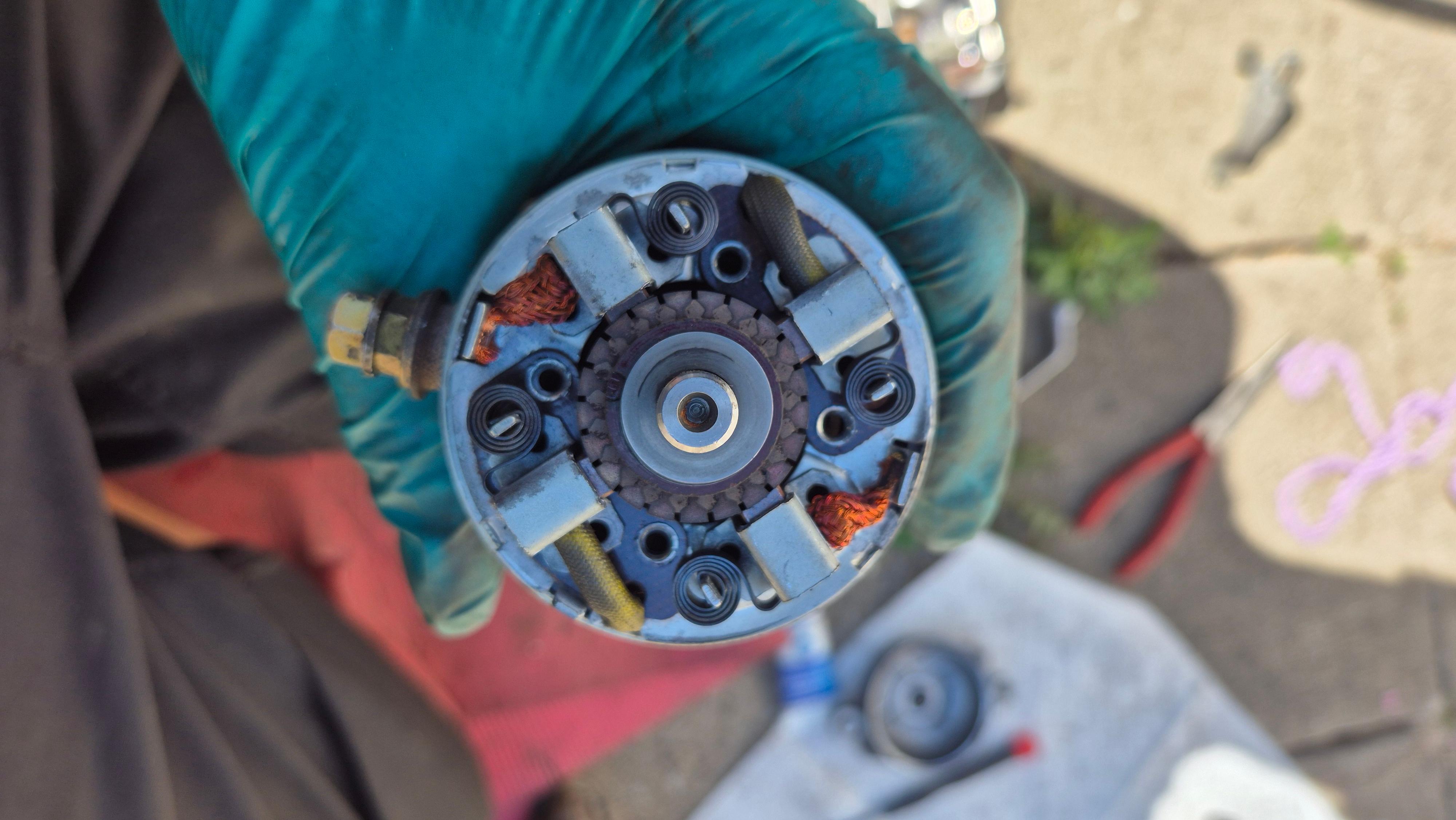 Ich konnte keine Negativitäten daran feststellen. Die Kohlenträgerplatte ist heile und nicht korrodiert, die Kohlen sind beweglich, die Kabel sehen gut aus. Also nur die Oringe gereinigt und mit Silikonfett geschmiert und alles wieder eingebaut.
