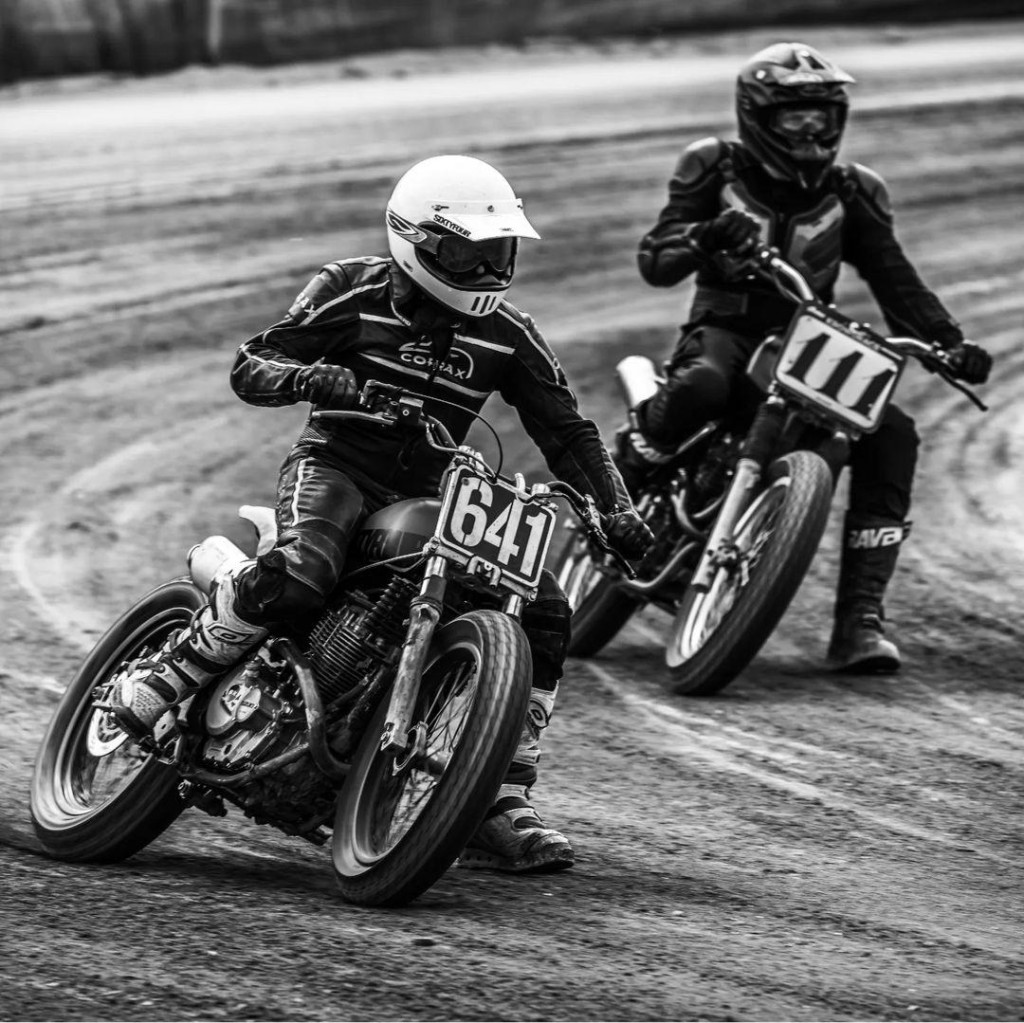19"-Felgen mit 130er und 140er Flattrackreifen, große Startnummertafeln, breitem Lenker und keiner Vorderrad-Bremse.